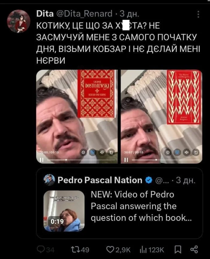 Подписчики тиктокера в основном похвалили литературные вкусы кинозвезды, оставив комментарии вроде "Я всегда знала, что он человек с утончённым вкусом и культурой". Однако в Х (твиттере) актёру досталось, и его даже прозвали Педро Москаль.