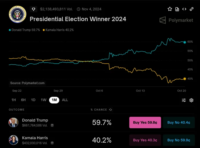 На платформе Polymarket можно ставить на вероятного победителя выборов. Как видно на графике, месяц назад Харрис даже опережала Трампа, но в последнее время народ уверенно ставит свои деньги на Дональда.