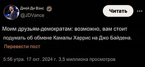 Вскоре после этого, кандидат в вице-президенты от республиканцев Джей-Ди Вэнс предложил даже вернуть Байдена в гонку: