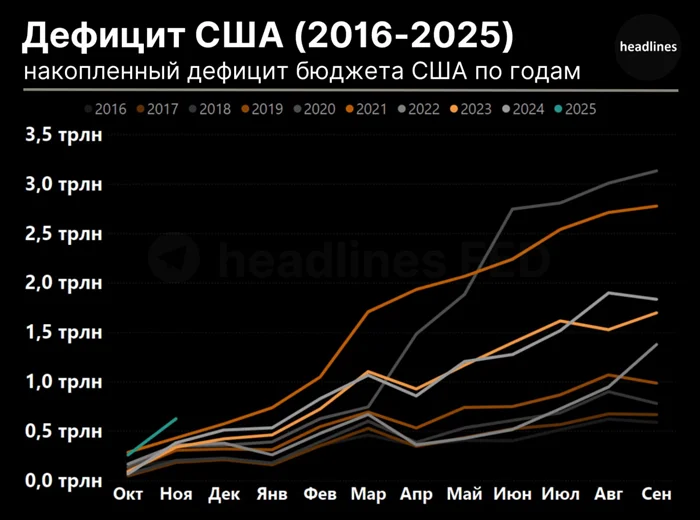 Всего за первые два месяца 2025 финансового года (начиная с сентября) дефицит составил $624 млрд и продолжает расти.