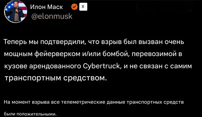 "Они выбрали неподходящий автомобиль для взрыва. Cybertruck выдержал удар и направил взрывную волну вверх, практически не причинив ущерба. Даже стеклянные двери остались целыми," — отметил Илон Маск.