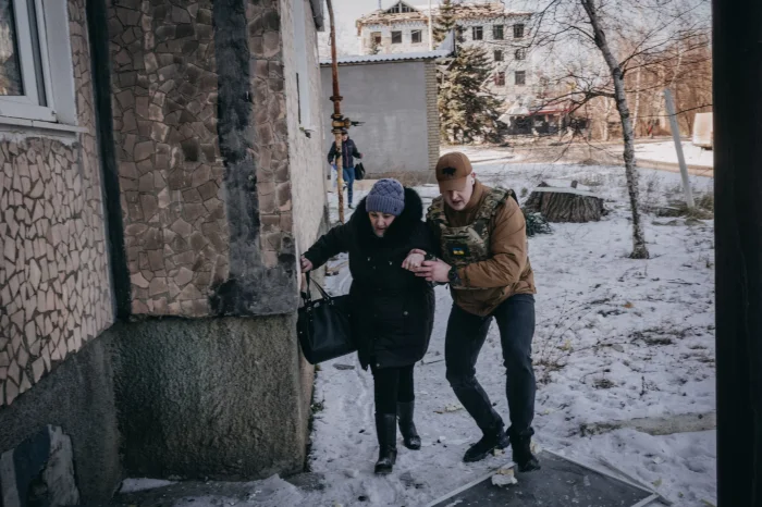 Жители бегут от российского авиаудара по промышленному городу Константиновка на Украине //ВОЙЦЕХ ГЖЕДЗИНСКИЙ/GETTY