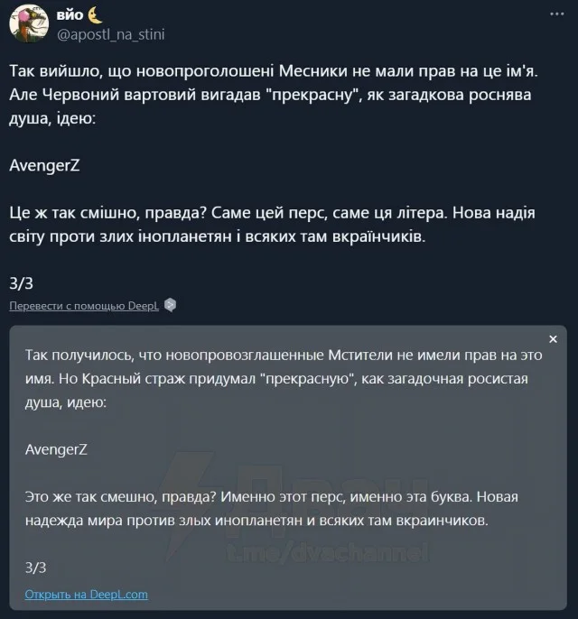 Известный бренд «Мстители» (Avengers) уже используется, и российский супергерой Красный Страж появляется с эмблемой «AvengerZ», что отсылает как к «Мстителям», так и к популярной военной символике в России.