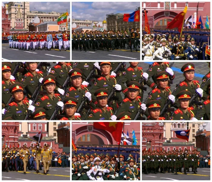 >В параде также участвовали курсанты Вьетнамской армии, солдаты из Египта, почётный караул из Китая, почётный парад из Лаоса, военнослужащие Монголии и почётный парад из Мьянмы.