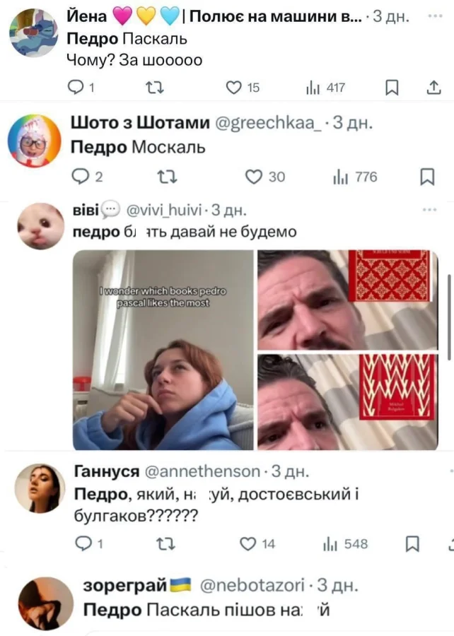 Подписчики тиктокера в основном похвалили литературные вкусы кинозвезды, оставив комментарии вроде "Я всегда знала, что он человек с утончённым вкусом и культурой". Однако в Х (твиттере) актёру досталось, и его даже прозвали Педро Москаль.