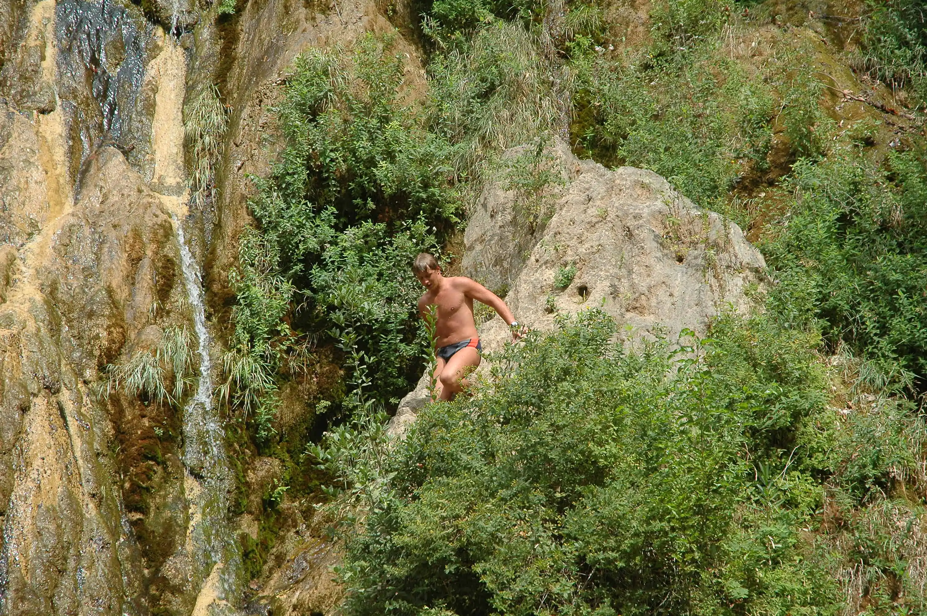 Русский турист в кимере на свой страх и риск вскарабкался по водопаду чтобы сфоткаться ! но оказалось что назад слесть невозможно - пришлось прыгать !(прошу не судить строо это мой первый пост)
