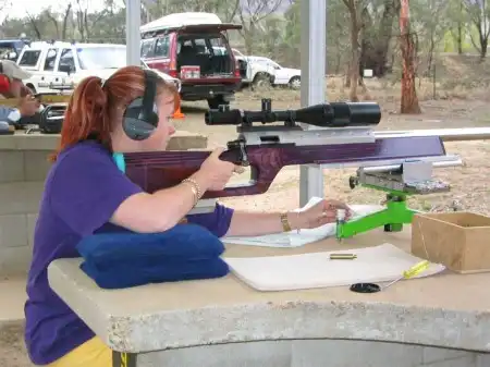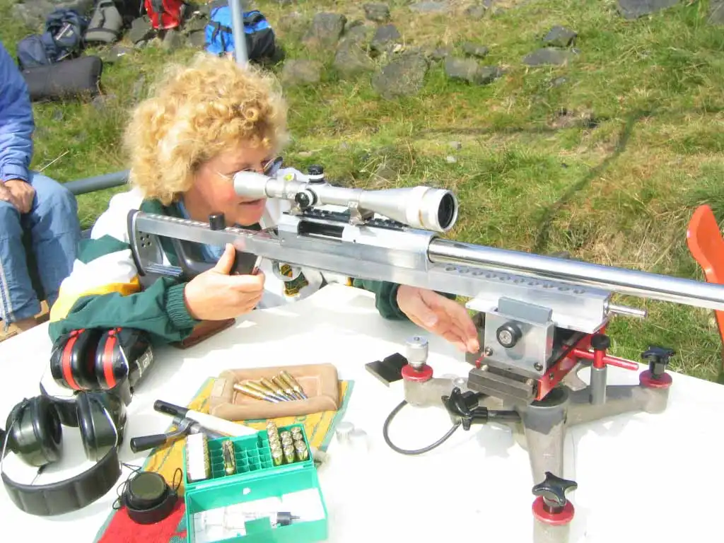 Энни Элиот (Annie Elliott) с легкой 1000-ярдовой винтовкой, построенной на алюминиевой ложе. Патроны уложены на мягкую подложку - упаси бог деформировать пулю