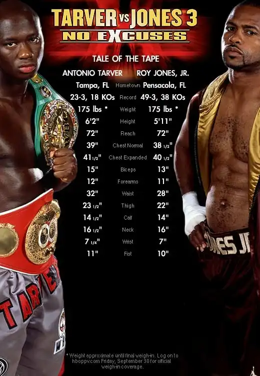 Какой бой,вы че гоните это старые афиши,эти бои прошли уже года четыре как назад.У Роя Джонса намечен только один бой в ближайшее время и это не Тарвер(которого кстани нету даже в квалификациях на данный момент).