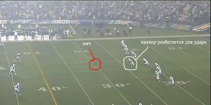 Игроки одной из команд (какой именно - определяет жребий, назовем ее Команда Б) выстраиваются на своей 30-ярдовой линии (линии в 30-ти ярдах от своей конечной зоны), и один из них (kicker - киккер) наносит удар ногой по мячу, предварительно установленному на специальную подставку, пытаясь отправить его как можно дальше на половину поля соперников.