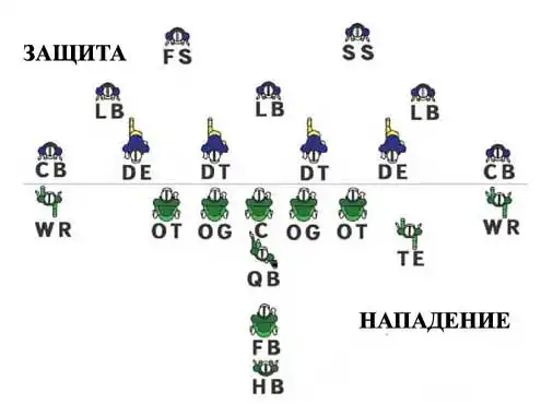 DE – defensive end (энд защиты), DT – defensive tackle (тэкл защиты), CB – cornerback (корнербек или угловой), LB – linebacker (лайнбэкер), FS и SS – free safety (фри сэйфти) и strong safety (стронг сэйфти).