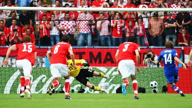 Матч хорваты начали, что называется, с места в карьер, сразу ринувшись в атаку. Первый удар по воротам нанёс Петрич, который у нападающего явно не получился. Впрочем, не успели австрийцы по-настоящему войти в игру, как в их ворота был назначен пенальти. Уже на третьей минуте поединка Эмануэль Погатец на правом фланге защиты в штрафной площади сбил нападающего Ивицу Олича, который знаком российским болельщикам по выступлению за ЦСКА. Голландский арбитр Питер Винк, ни секунды не колебавшись, указал на точку. Уверенность в своей правоте у судьи была настолько большая, что он, таким образом, решился наказать команду – хозяйку турнира, на глазах разгневанных болельщиков. А ведь считается, что арбитры очень благосклонно относятся к той команде, где проходит крупный турнир. Впрочем, пенальти был действительно стопроцентный. Привести приговор в исполнение вызвался Лука Модрич, точным ударом по центру, послав мяч в сетку ворот – 0:1.