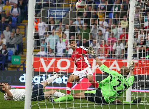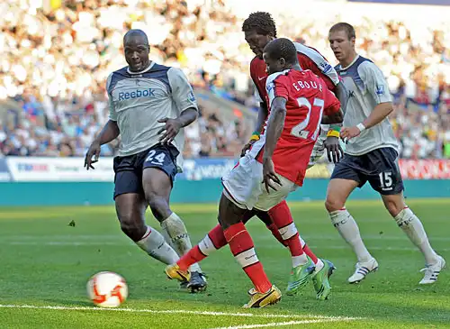 Эммануэль Эбуэ из "Арсенала" восстанавливает равновесие в поединке своей команды с "Болтоном". Очень похоже, что гол был забит из офсайда.