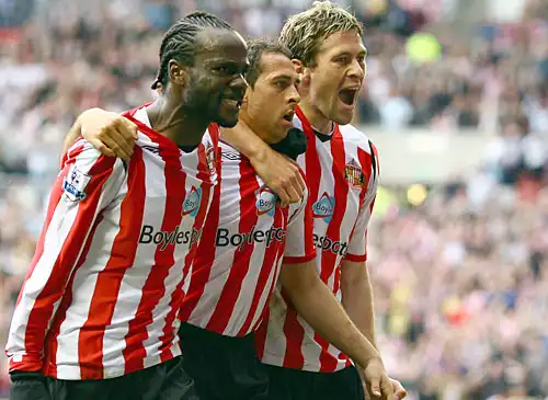 Одноклубники поздравляют нападающего "Сандерленда" Майкла Чопру (в центре) с голом в ворота "Мидлбсро".