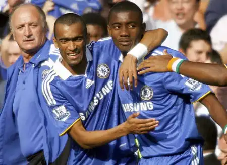 Жозе Босингва поздравляет нападающего Саломона Калу, который, выйдя на замену во втором тайме, сравнял счет в поединке "Челси" и "Манчестер Юнайтед".
