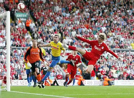 Удар нападающего "Ливерпуля" Фернандо Торреса приходится немного выше перекладины ворот "Стоука" во время матча этих команд на "Энфилде".