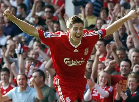 Капитан мерсисайдцев Стивен Джеррард празднует свой сотый гол за клуб. Он еще не знает, что через мгновение рефери отменит взятие ворот и вернет количество голов полузащитника вновь к цифре 99.