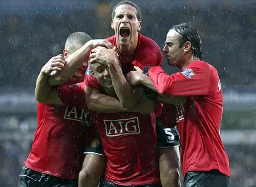 Одноклубники поздравляют защитника "Манчестер Юнайтед" Уэса Брауна с голом в ворота "Блэкберна".