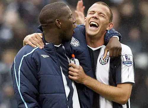 Исмаэль Миллер поздравляет своего коллегу по "Вест Бромвичу" Романа Беднара с голом в ворота в "Фулхэма".