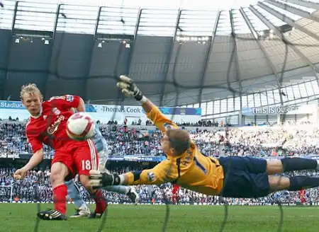 Нападающий "Портсмута" Питер Крауч в зрелищном прыжке поражает ворота "Стоука".