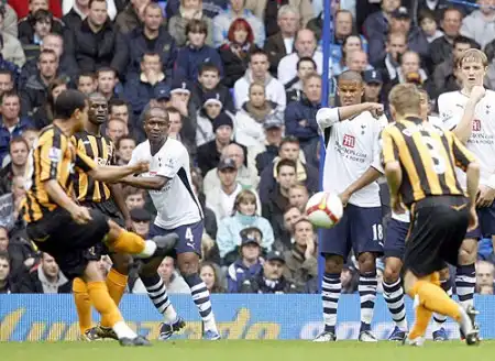 Бразильский полузащитник "Халла" Джованни отправляет мяч со штрафного в ворота своего соотечественника Эурельо Гомеса, защищающего цвета "Тоттенхэма".