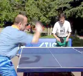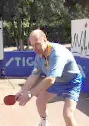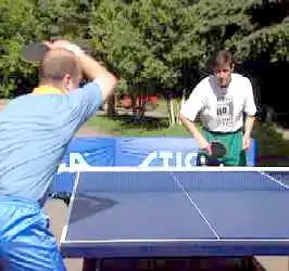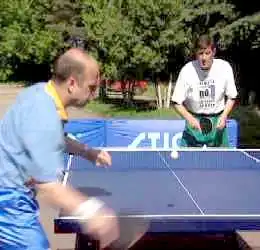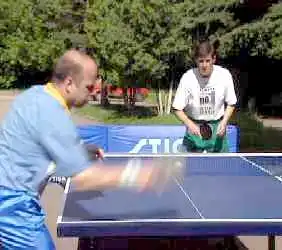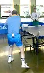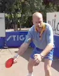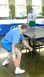 А вот против мяча с нижнем вращением вам придется уже приседать, а точнее - подседать под мяч. Вам надо как бы вырвать его вверх. Не забывая, конечно, о движении вперед, на стол. И обратите внимание на ноги. Эти два своеобразных домкрата постоянно в работе. С них и начинается топ-спин. Ракетка, в данном случае, немного приоткрывается. Но в завершающей фазе, как у пионера, опять находит свое место над головой в закрытом положении.