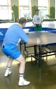 И Анатолию Амелину нет большой нужды делать сильный подсед под мяч, открывая при этом ракетку. К тому же мяч возвращается не очень быстро. Подставка носит характер простого возврата. Она даже немного смягчает топ-спин, позволяя атакующему нанести целую серию вращений с удобным интервалом.