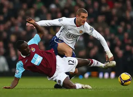 Единоборство нападающего "Вест Хэма" Карлтона Коула и защитника "Манчестер Юнайтед" Неманьи Видича.