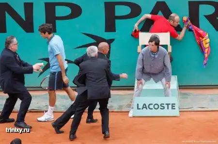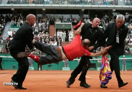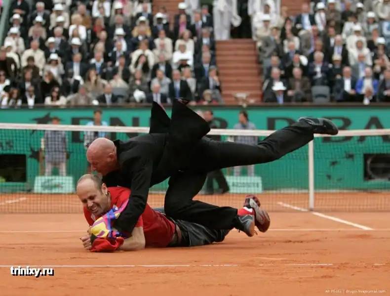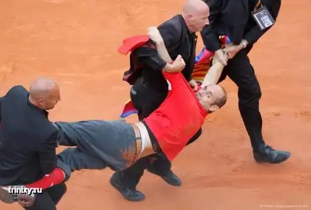 Роджер Федерер впервые в своей карьере выиграл "Ролан Гаррос", но до этого его решил поздравить сумасшедший испанский фанат Джимми Джамп, который и до этого славился подобными выходками.