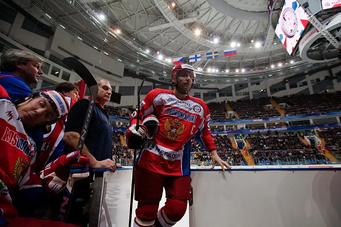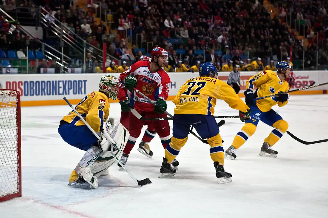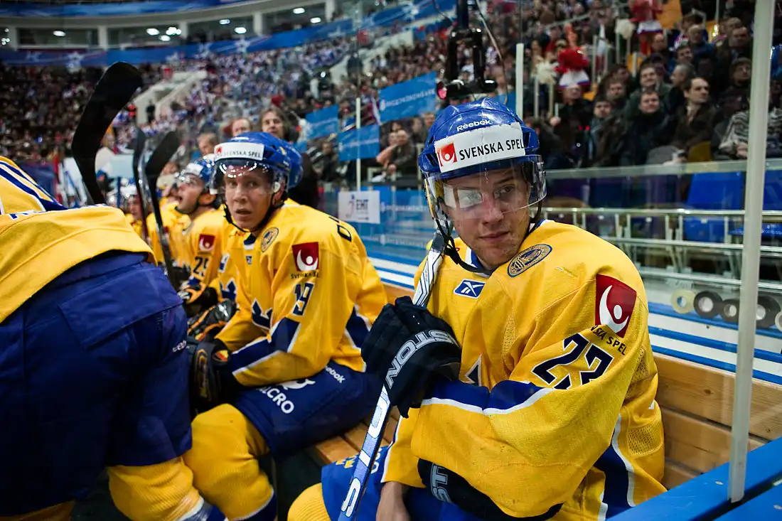 Вчерашняя съемка хоккейного матча Россия–Швеция — первая в моей практике. Так что, строго не судите. Было очень интересно. Современный хоккей вообще очень красивое зрелище — с яркой картинкой и мощной звуковой «оркестровкой». А тут еще и современный стадион, на льду — одни из лучших в мире сборных команд и у меня есть возможность снимать это вблизи — что это, как не настоящий праздник? Жалко только, что он так быстро кончился — игра пролетела, как одно мгновение.