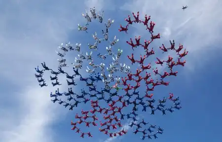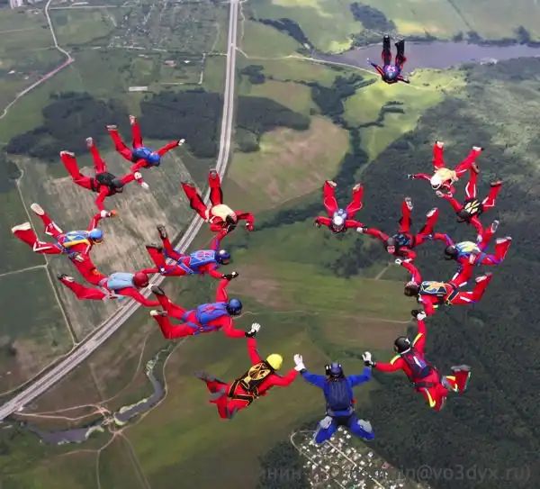 Со временем начала развиваться групповая акробатика. Это совместная работа 2х и более человек в свободном падении. Ответление ГА - большии формации. Это составление фигуры из большого кол-ва человек.