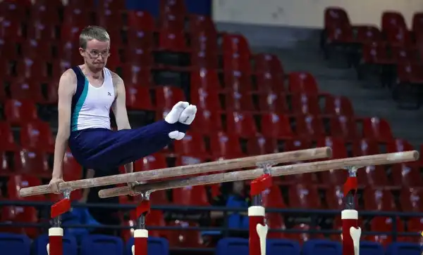 Ким Дженсен из Австралии в финале соревнования по спортивной гимнастике среди мужчин.