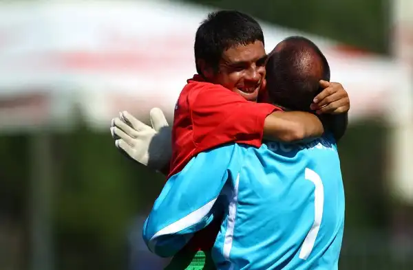 Филипе Кармо из Португалии (слева) с товарищем по команде Руи Сантосом радуется победе над сборной Австралии в матче по футболу.