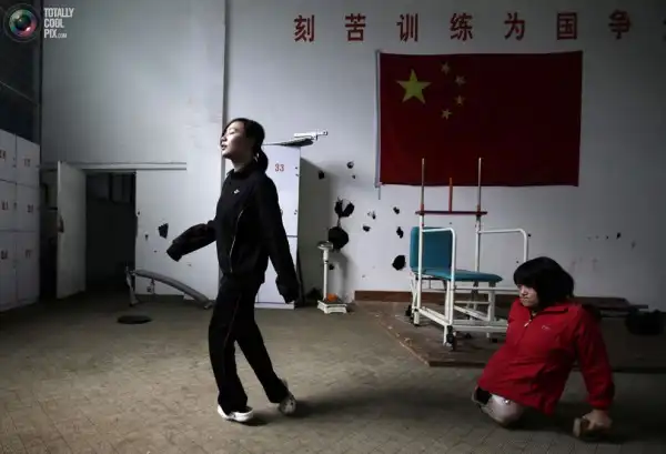16-летняя Цянь Хунянь взбирается на платформу во время ежедневных тренировок. (REUTERS/Jason Lee)