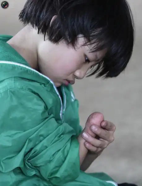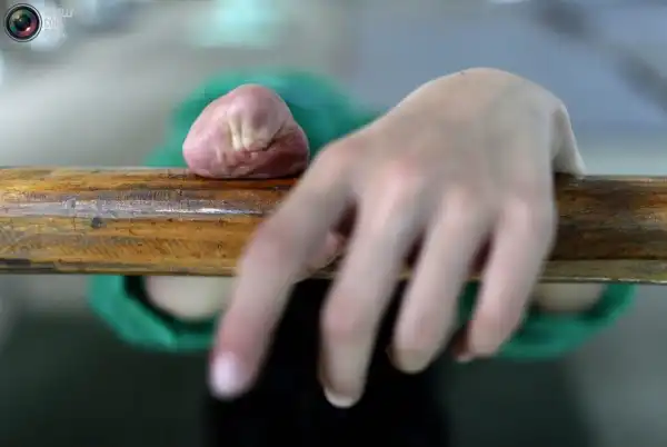 11-летняя Сюй Цзявэнь смотрит на свою изувеченную руку после отжиманий. (REUTERS/Jason Lee)