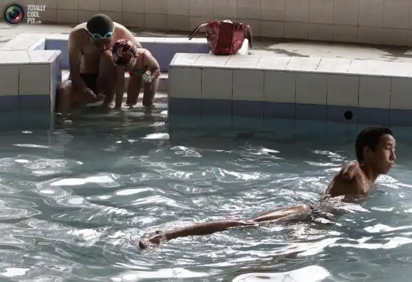Пань Цзиньпин расслабляется рядом с играющими в бассейне отцом и дочерью после ежедневной тренировки. (REUTERS/Jason Lee)