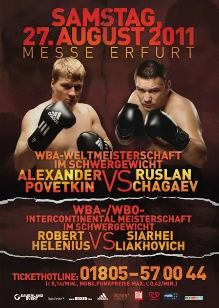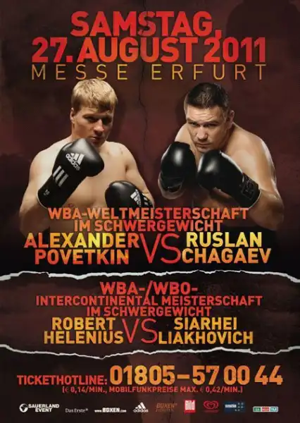 Вчера в Эрфурте (Германия) состоялась церемония взвешивания участников сегодняшнего вечера бокса. Участники главного боя за титул чемпиона WBA Руслан Чагаев и Александр Поветкин показали одинаковый вес: 105,0 кг.