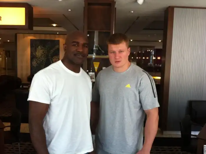 Бывший чемпион мира в двух весовых категориях Эвандер Холифилд и не имеющий поражений российский супертяжеловес Александр Поветкин позируют для фотографов в Эрфурте.