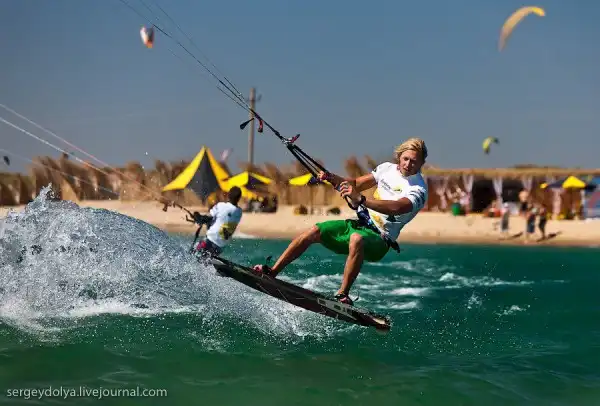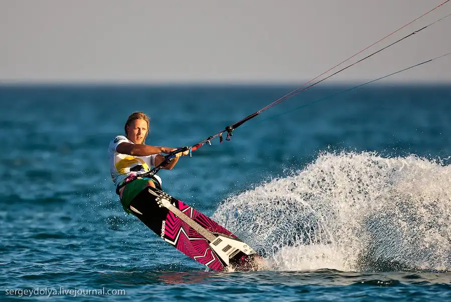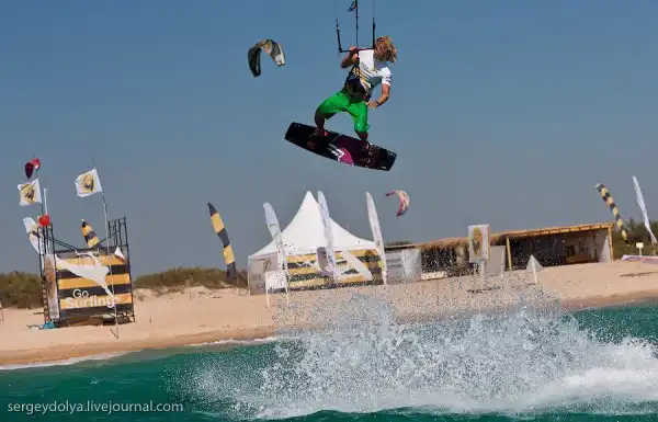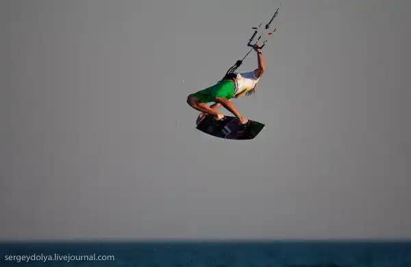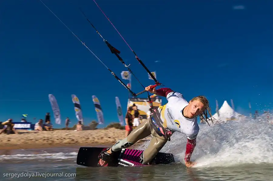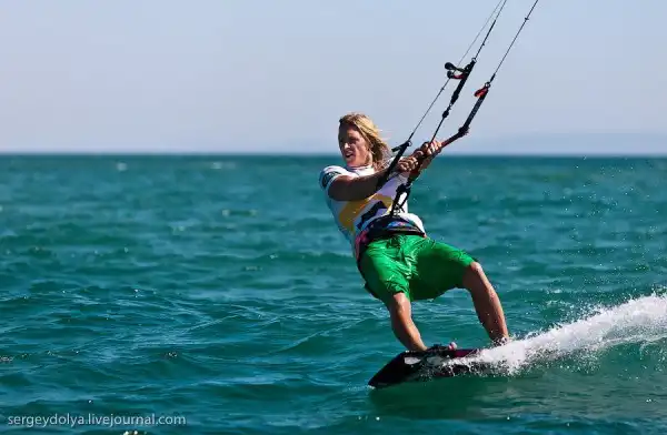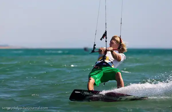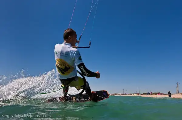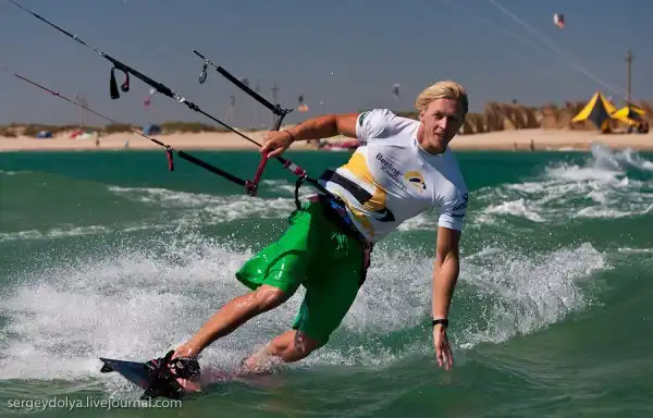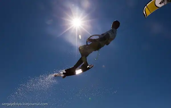 А это показательное выступление Чемпиона мира по кайтсерфингу Петра Тюшкевича — первого российского спортсмена, сумевшего пробиться в элиту мирового кайтинга.