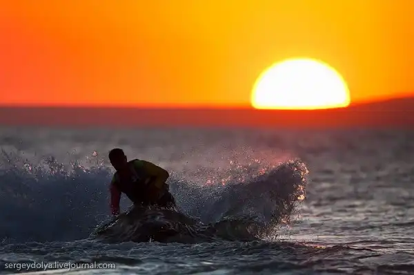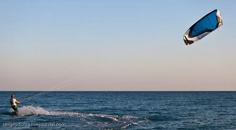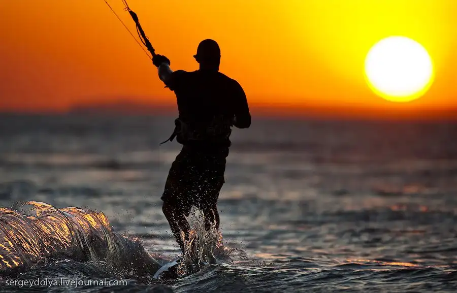 Ночью или в безветренную погоду кайтеры вынуждены сидеть на берегу. Вообще-то кататься на закате уже нельзя, но некоторые кайтеры нарушают это правило: