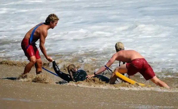 1 сентября, Калифорния. Спасатели помогают серфенгистке выйти из океана. В тот день высота волны на пляже Ньюпорт достигла уровня 6 метров. Зимний шторм у побережья Австралии и Новой Зеландии породили небывало высокие волны у берегов Южной Калифорнии.