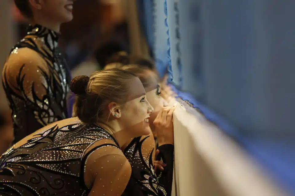 Американские гимнастки смотрят за кулисами, как их соотечественница Джули Эшли Зетлин получает золотую медаль, выиграв индивидуальное соревнование с мячом.