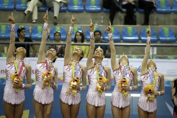 Бразильская сборная по художественной гимнастике получает золотую медаль.