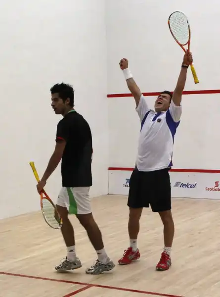 Золотой медалист Мигель Родригес из Колумбии (справа) радуется победе над мексиканцем Цезарем Салазаром в конце матча по сквошу.
