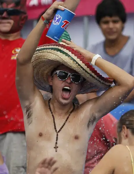 Мексиканский фанат женской сборной по волейболу подбадривает себя, команду и остальных болельщиков во время матча сборной против Пуэрто-Рико.