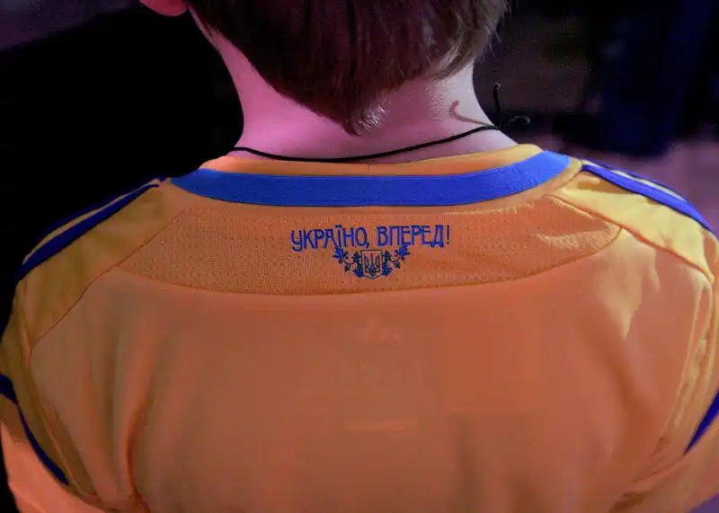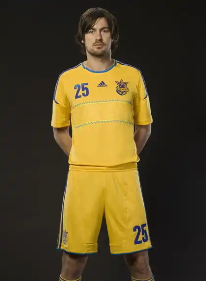 Цвета национального флага присутствуют на воротниковой канве футболки, окантовке шорт и логотипе Федерации футбола Украины. Сзади на воротниковой зоне также размещены герб Украины и призыв-лозунг «Україно, вперед!».