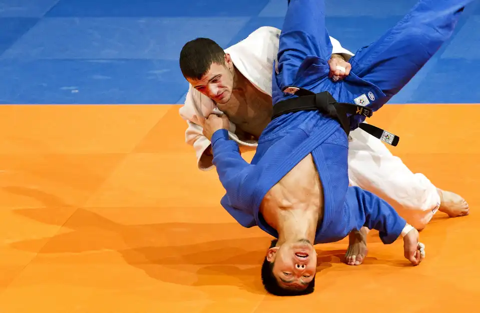 Тумуркхулег Даваадор из Монголии (впереди) и Амиран Папинашвили из Грузии на Гран-при по дзюдо в категории 60 кг в Амстердаме. (Koen van Weel/AFP/Getty Images)
