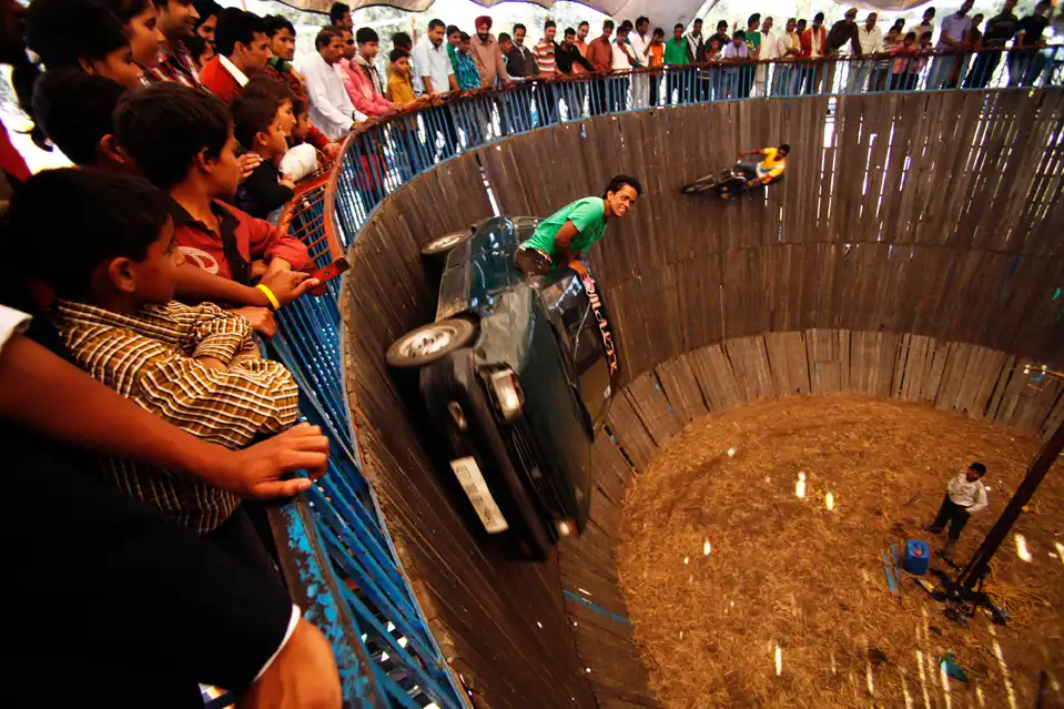Каскадеры на автомобиле и мотоцикле на «Стене смерти» развлекают зрителей во время ярмарки на окраине Джамму, Индия. (Channi Anand/AP)