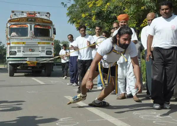 Облачившись в роликовые коньки, Капил Гелот тащит грузовик весом 9 тонн в Джодхпуре. Гелот сумел побить собственный рекорд, протащив грузовик на 68 метров. (Strdel/AFP/Getty Images)