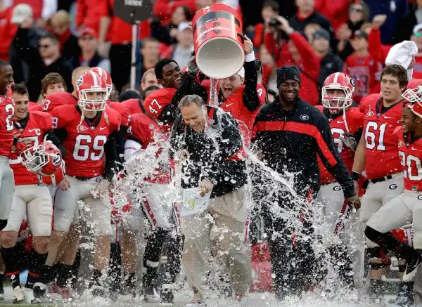 Главного тренера сборной Джорджии марка Рихта обливают водой на последних секундах матча против сборной Кентукки в Афинах, штат Джорджия. Обливание тренеров победившей команды водой – американская спортивная традиция. (David Goldman/AP)
