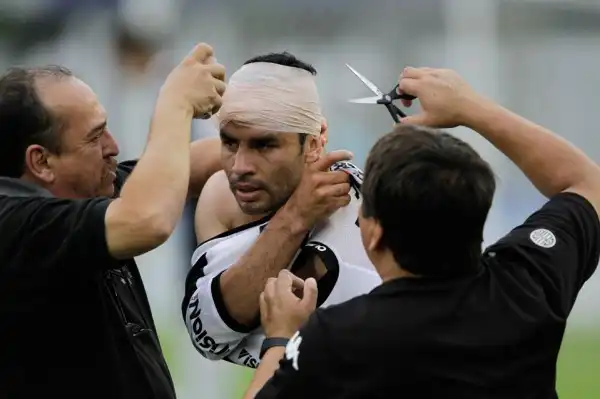 Франциско Нахера из «Olimpia» оказывают помощь во время матча по футболу против «Cerro Porteno» в Асунсьоне. (Mario Valdez/Reuters)
